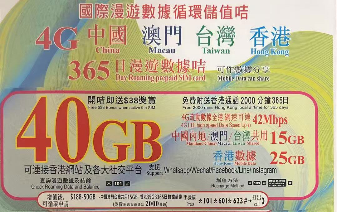 | 流量 | 总 40GB:香港 25GB;中国/澳门/台湾共享 15GB |