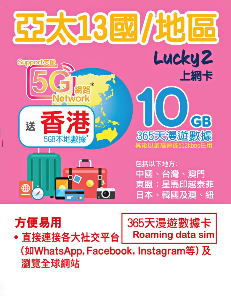 【13国家/地区】365日 10GB) 5G/4G漫游数据年卡体验快速可靠的数据连线。